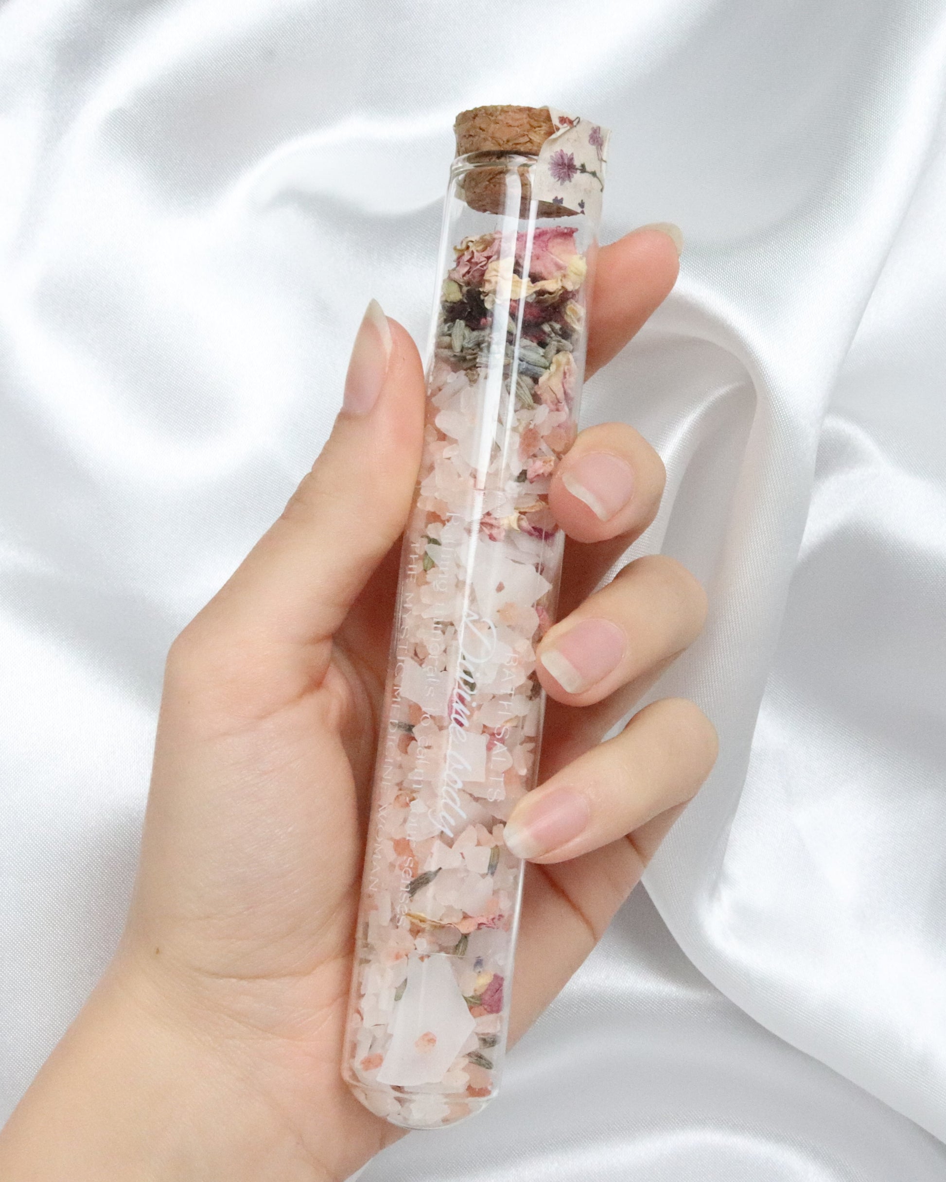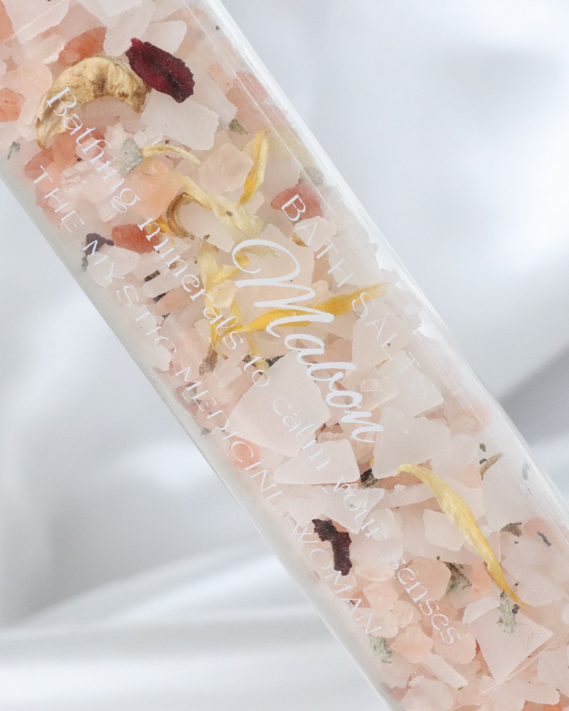 The bath salts are for external use only. Do not ingest or apply directly to the skin in high concentrations. Avoid contact with eyes, mouth, and other sensitive areas. If irritation occurs, discontinue use immediately. Keep out of reach of children and pets. Some ingredients may cause allergic reactions, always do a patch test if unsure. Store in a cool, dry place and keep the container sealed to prevent moisture buildup.